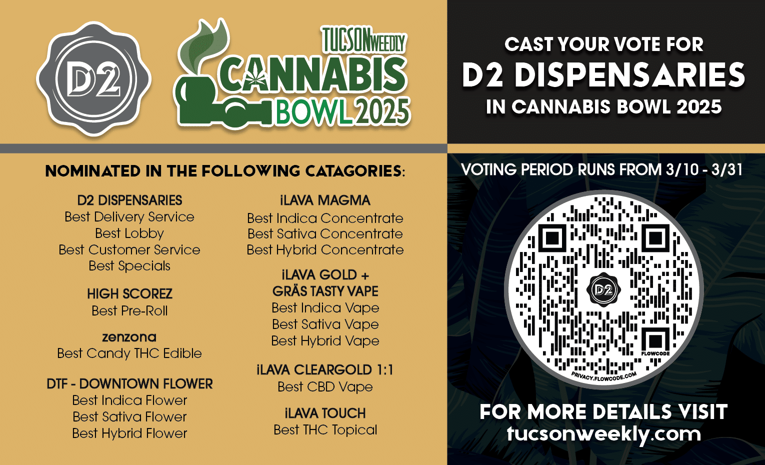 It’s time once again to vote for your favorite dispensaries and brands in Tucson Weekly’s Cannabis Bowl 2025! Vote for D2 Dispensaries!