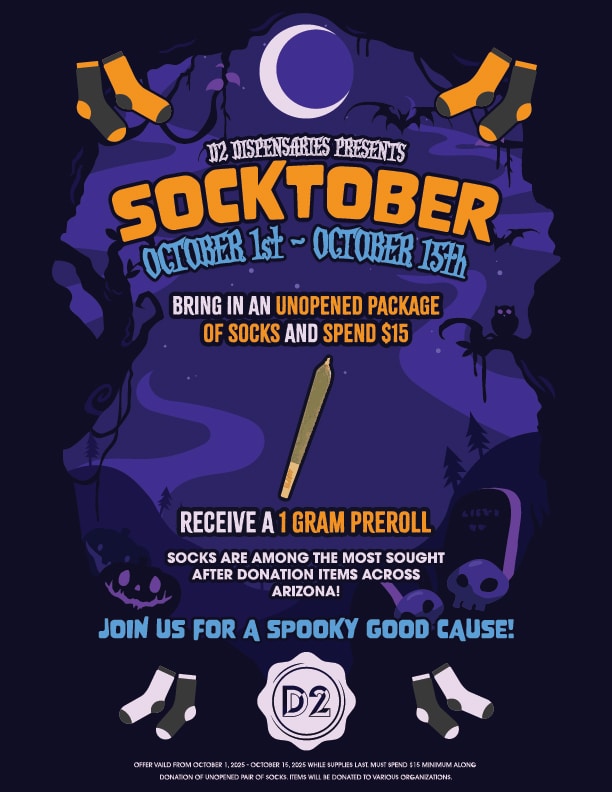 This October, D2 Dispensaries is giving our community a reason to step up and give back! We’re collecting unopened packages of socks to donate to local organizations that support those in need.